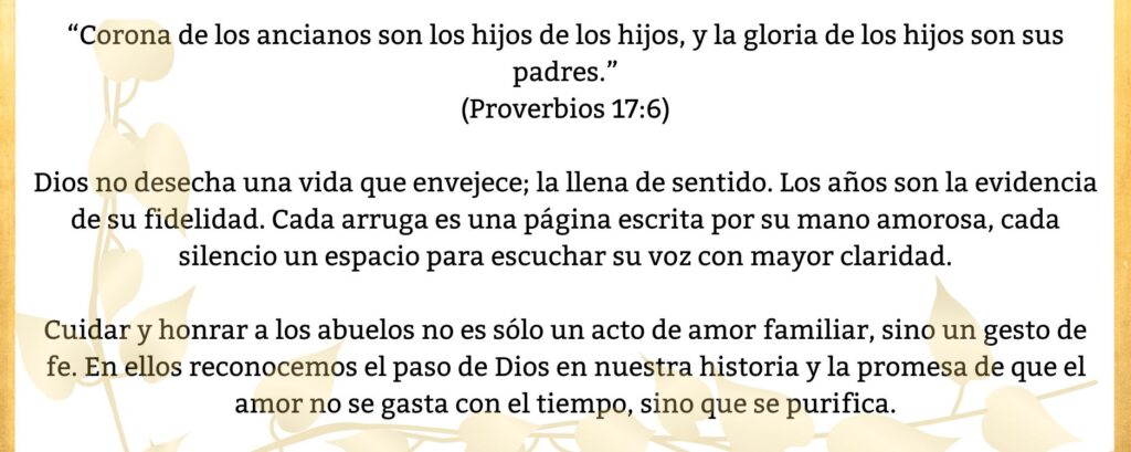 Vivimos en una cultura que valora lo útil, lo rápido, lo nuevo. En ese contexto, la vejez parece no tener valor. Pero los abuelos no son una carga: son memoria viva, raíz y sabiduría encarnada. Han trabajado, amado, sufrido y aprendido. En ellos hay historias que educan más que mil sermones, paciencia que calma más que cualquier terapia, y fe que sostiene cuando todo parece derrumbarse.